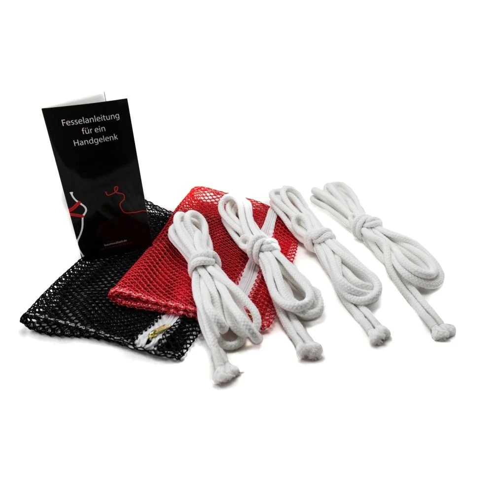 Das Miniset besteht aus 4 x 3 Meter Seil 6 mm mit Seele. Alle Seilenden werden in Handarbeit mit einem Takel in Seilfarbe versäubert. Ergänzt wird das Bondageset durch eine bebilderte Fesselanleitung für Hand- oder Fußgelenke und einen Wäschesack in rot oder schwarz.