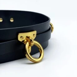 Ein großer runder Ring in der Mitte des Gurtes ist nicht nur optisches Highlight. Er sorgt für die nötige Funktionalität, an ihm kann man zum Beispiel Handfesseln befestigen. Die Metallplatte, die den Ring hält, ist ebenfalls außergewöhnlich in Form und Funktion. Sie ist fest mit der Manschette verbunden und stabilisiert zugleich den Riemen, der die Manschette schließt. Insgesamt 5 D-Ringe sorgen außerdem am Gurt für Fixiermöglichkeiten. In diesen D-Ringen können auch die Hogtie-Snaps eingehängt werden, um die passenden Schenkelbänder nach oben, hin zum Bondagegürtel, zu fixieren.