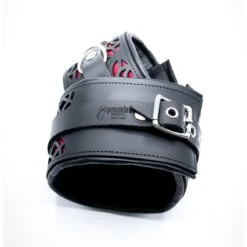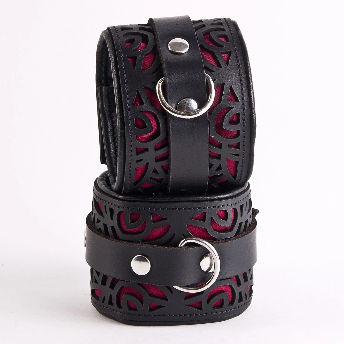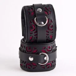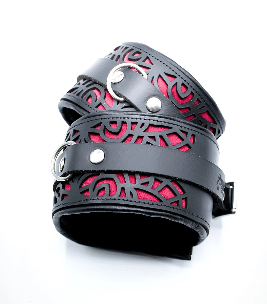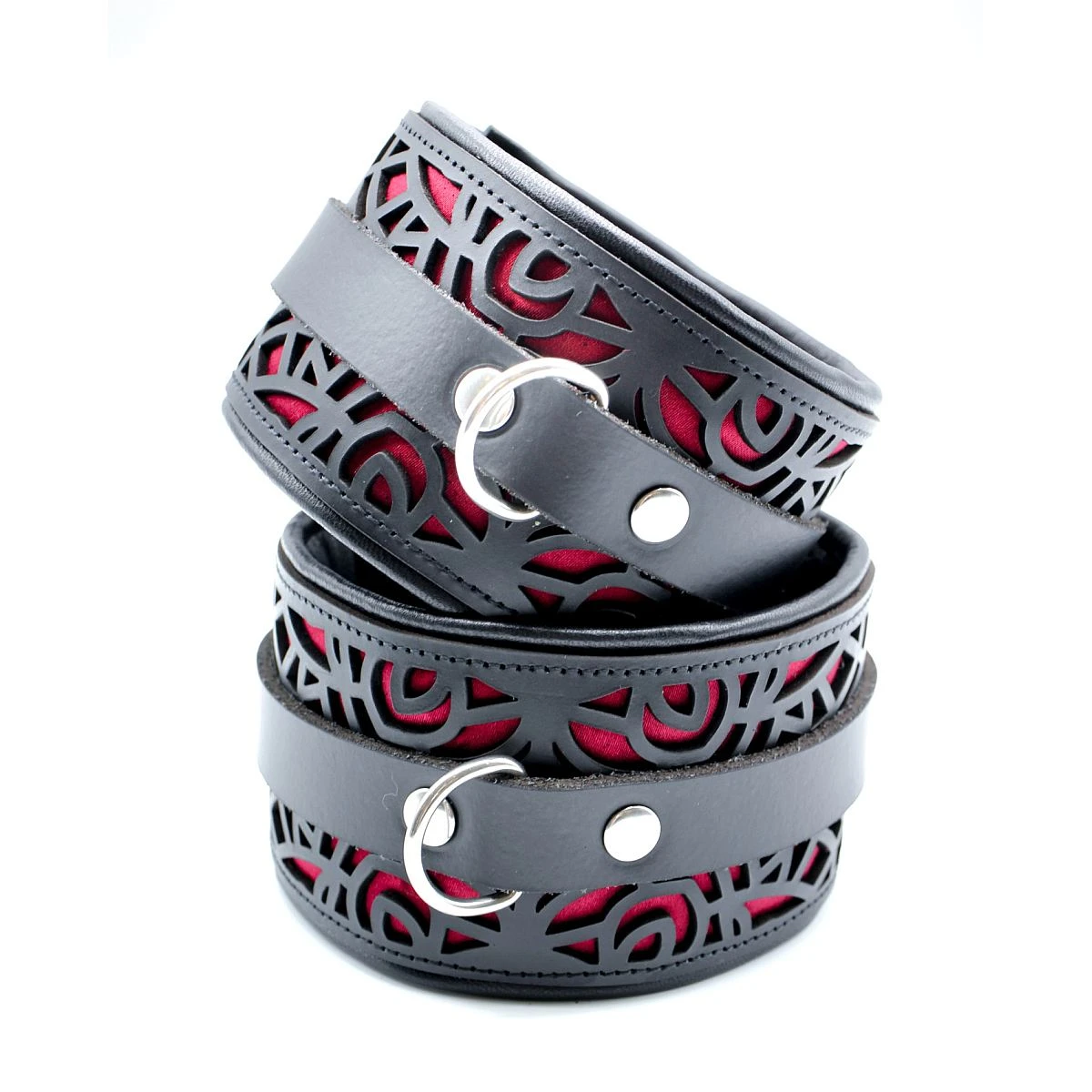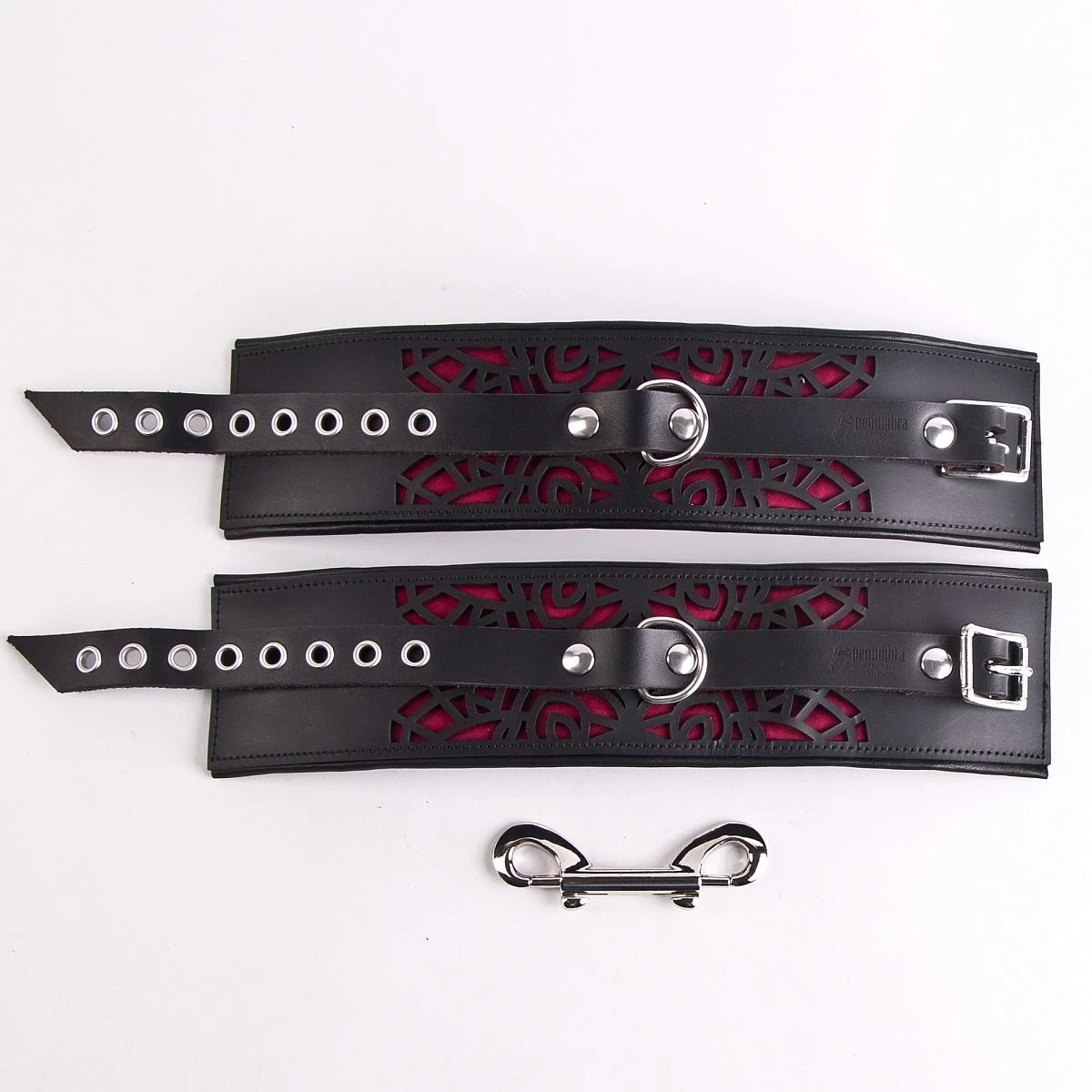 Die aufwändig in Handarbeit gefertigten Fußfesseln bestehen aus einer stabilen Außenlage aus feinem, stabilem Büffelleder mit einem lasergeschnittenen Muster das mit bordeaux-rotem Satin hinterlegt ist. Auf der Innenseite bestehen die Fußfesseln aus herrlich weichem, leicht gepolstertem Lammleder, was sie sehr angenehm tragbar macht auch über längere Zeit, zum Beispiel über Nacht oder sogar zum Ausgehen.