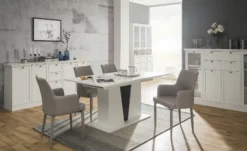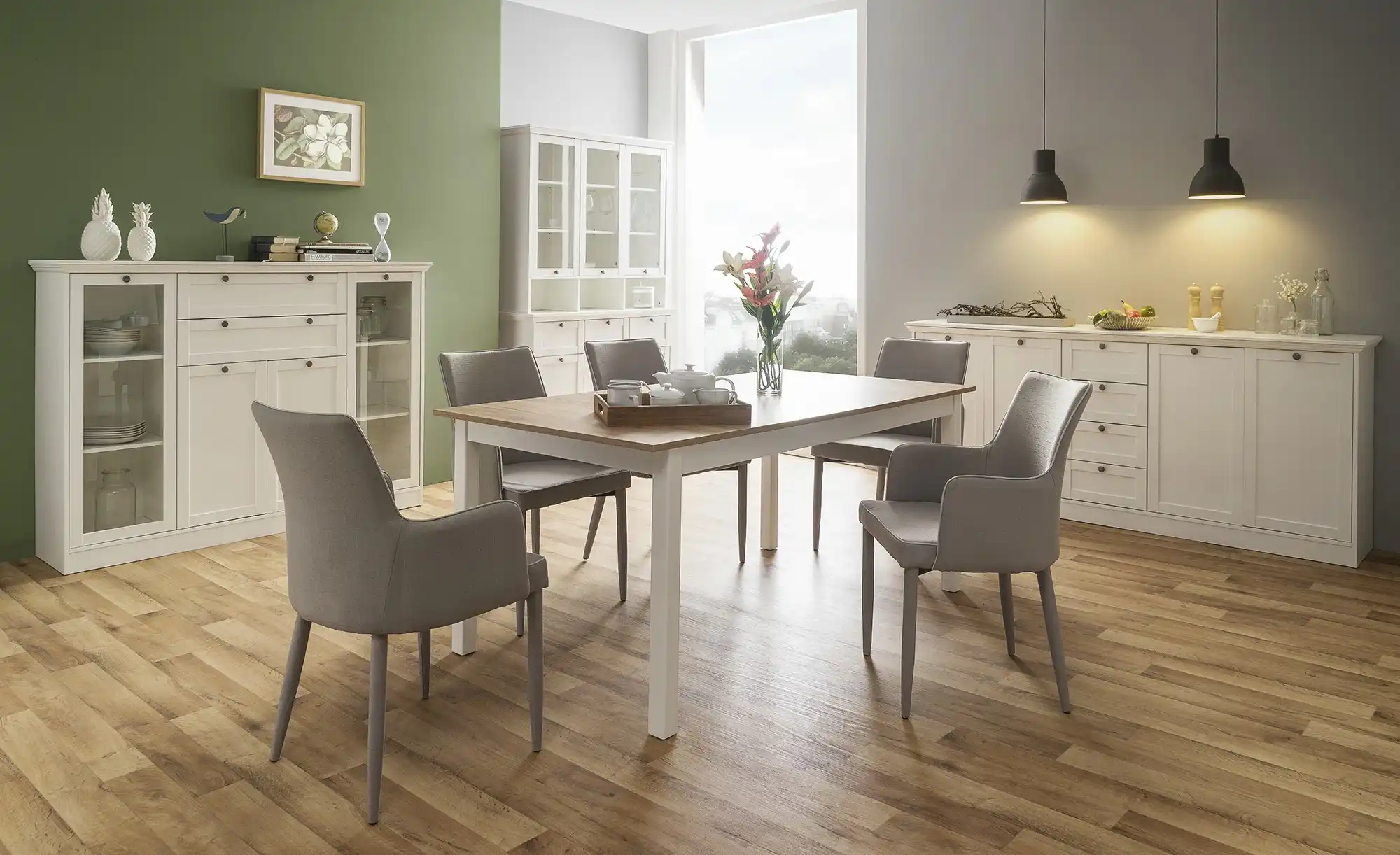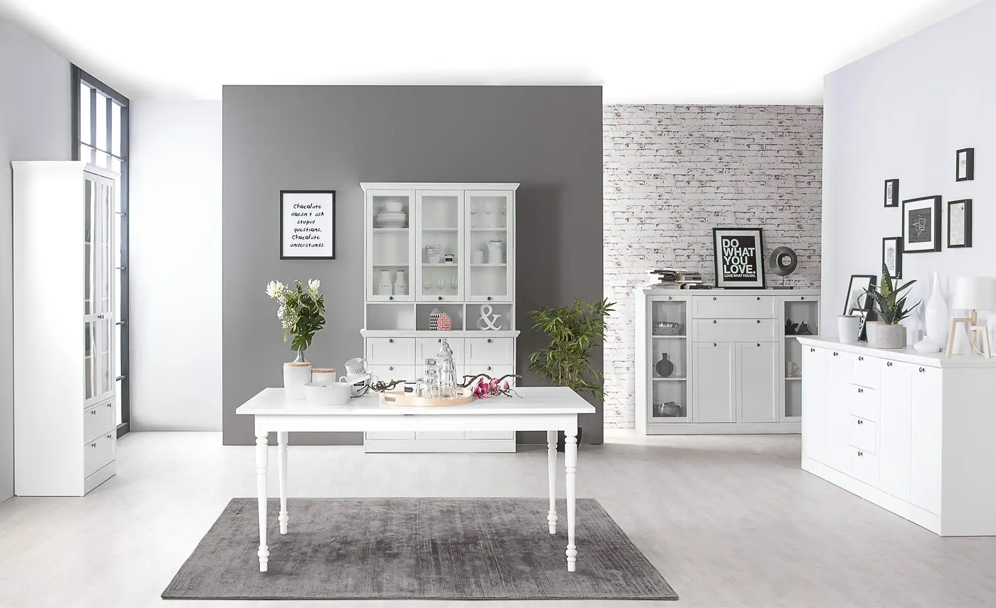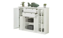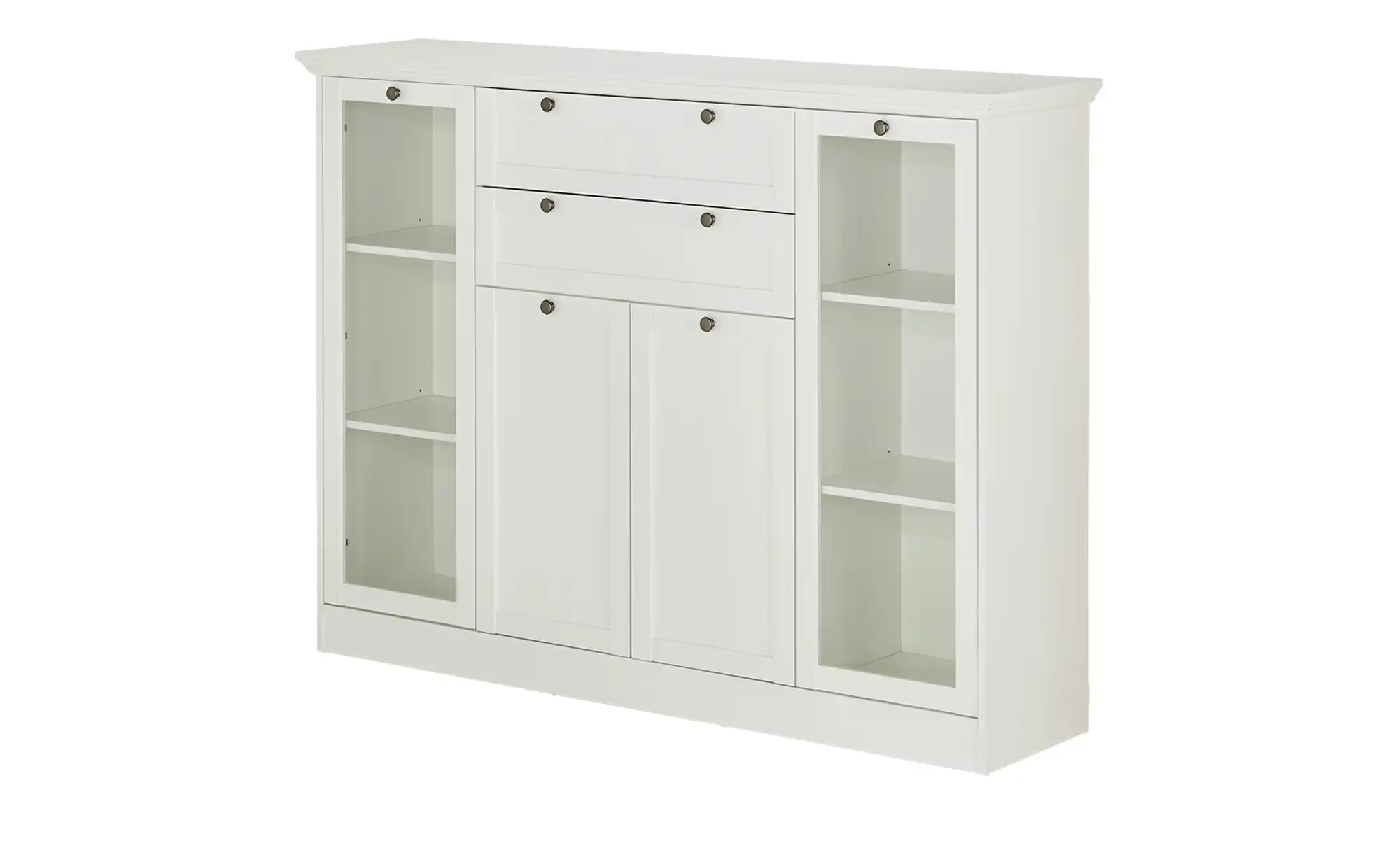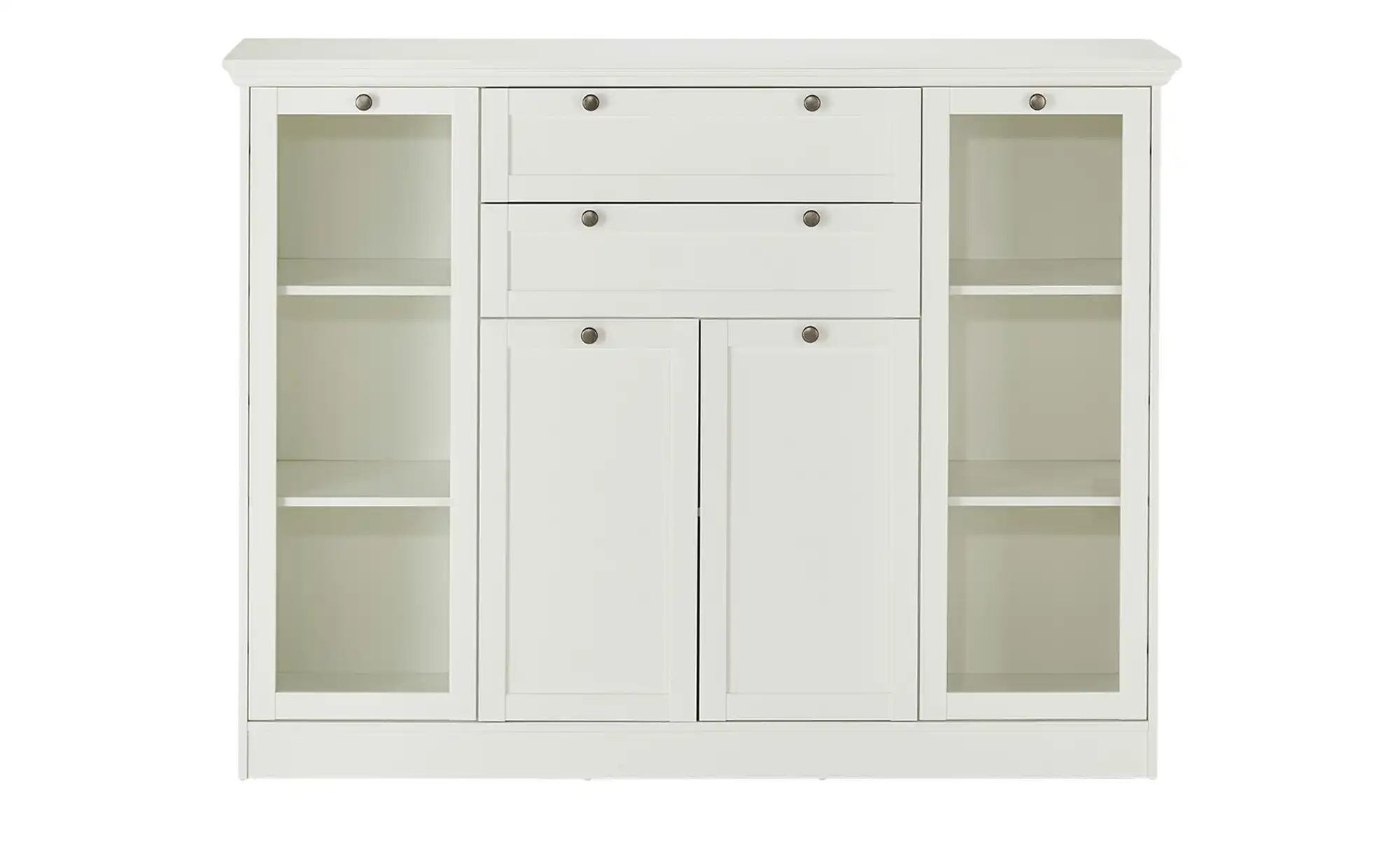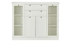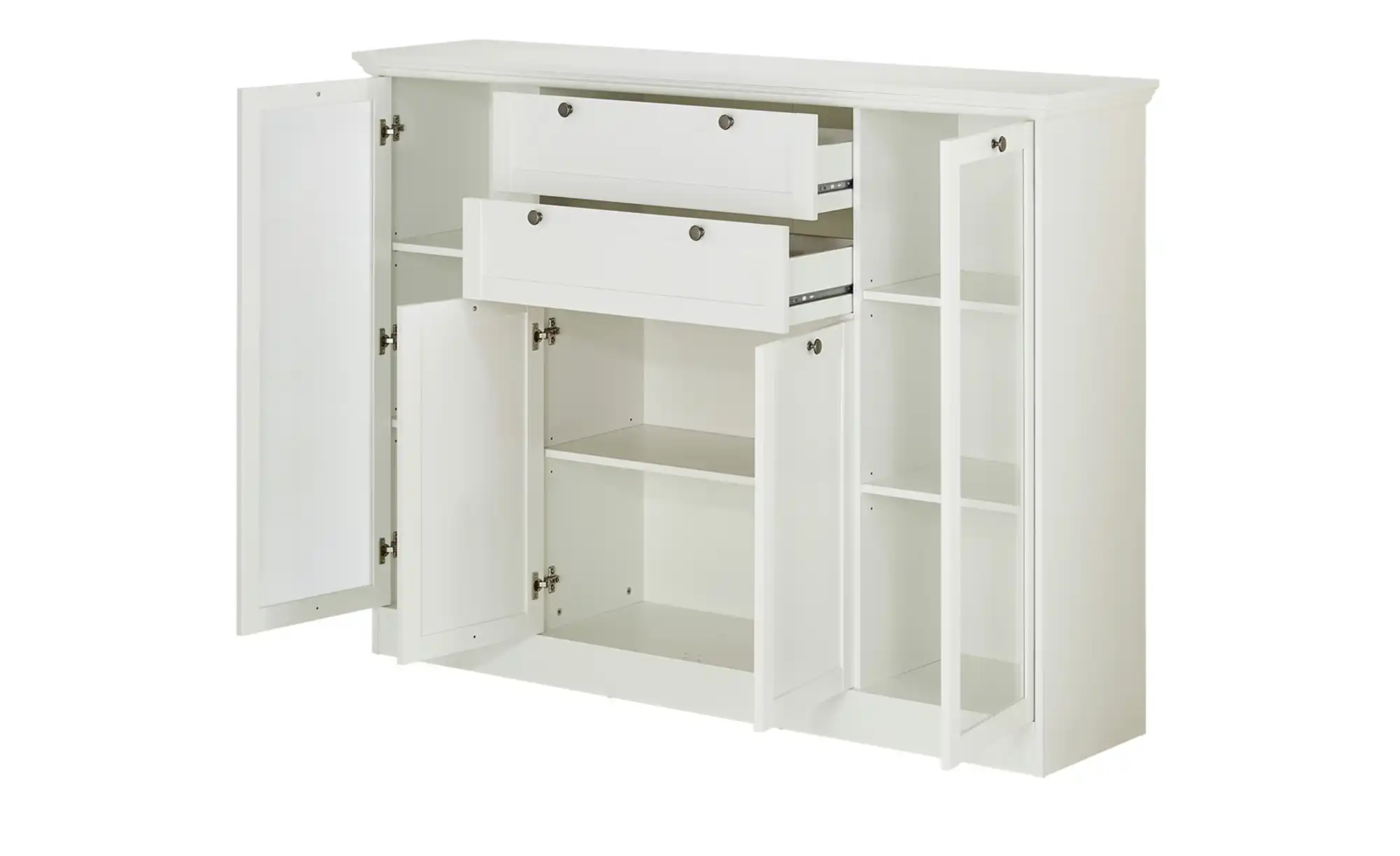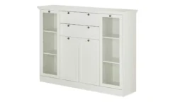 Im Highboard Laurito können Sie Lieblingsstücke präsentieren. Das geht in den je drei seitlichen Vitrinenfächern. Die Türen vor den Fächern sind mit Klarglas abgesetzt, was einen freien Blick in die Fächer erlaubt. Weitere Staumöglichkeiten befinden sich in den beiden Schubladen und hinter den beiden mittigen Türen. Das Material macht Oberflächen unempfindlich. Staub lässt sich ganz leicht wegwischen. Laurito ist im Landhausstil designt und passt zu den anderen Modellen der Serie.