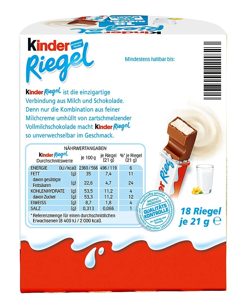 kinder Riegel ist die einzigartige Verbindung aus Milch und Schokolade. Denn nur die Kombination aus feiner Milchcreme umhĂĽllt von zartschmelzender Vollmilchschokolade macht kinder Riegel so unverwechselbar im Geschmack. Bestens geeignet als Wurfmaterial fĂĽr Karneval / Fasching