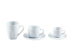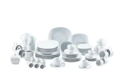 Ob beim Frühstück mit der Familie, dem Kaffeeklatsch mit Freunden oder beim Espresso zwischendurch – ohne Geschirr isst und trinkt es sich nur halb so gut. Das Kombiservice Tivoli bietet Ihnen mit seinen 62 Teilen alles, was Sie brauchen. Neben Kaffeetassen und –bechern, Espressotassen und den dazugehörigen Untertellern und Desserttellern, gehören dazu auch tiefe und flache Teller und Eierbecher. Auch eine Zuckerdose und ein Milchkännchen gehören zu dem Service. Das gesamte Geschirr besteht aus Porzellan. Das Service ist in einem neutralen und stilvollen Weiß gehalten und wirkt sehr modern. Denn wie so schön gesagt wird: das Auge isst mit. Wir wünschen guten Appetit.