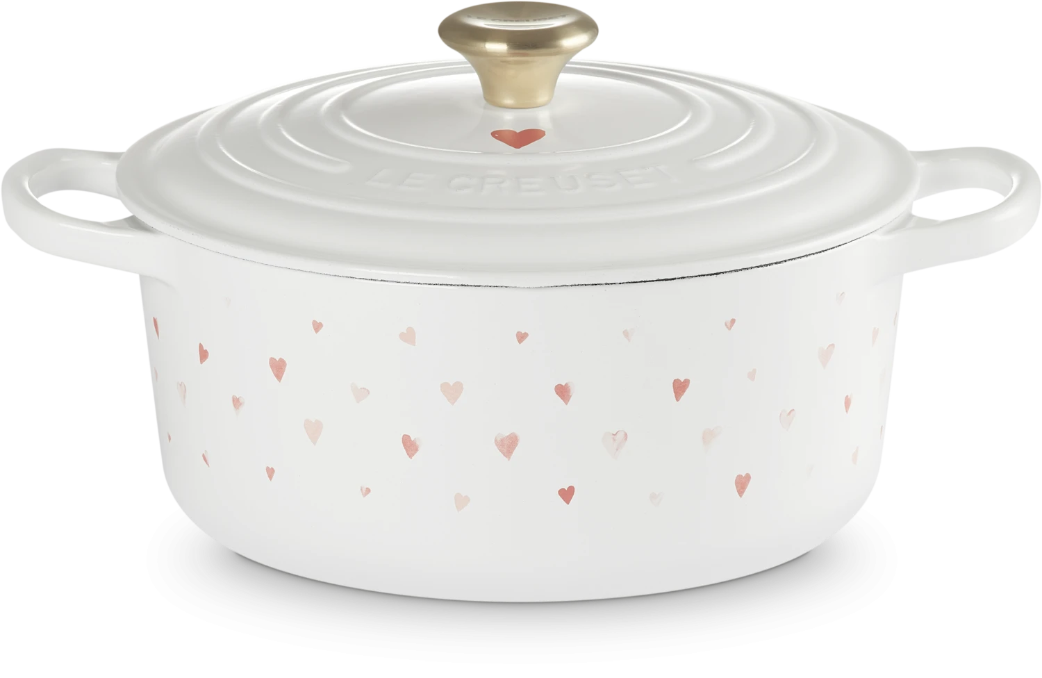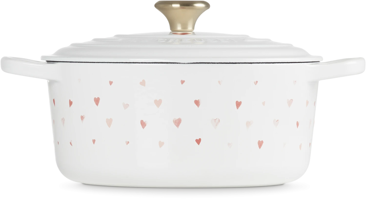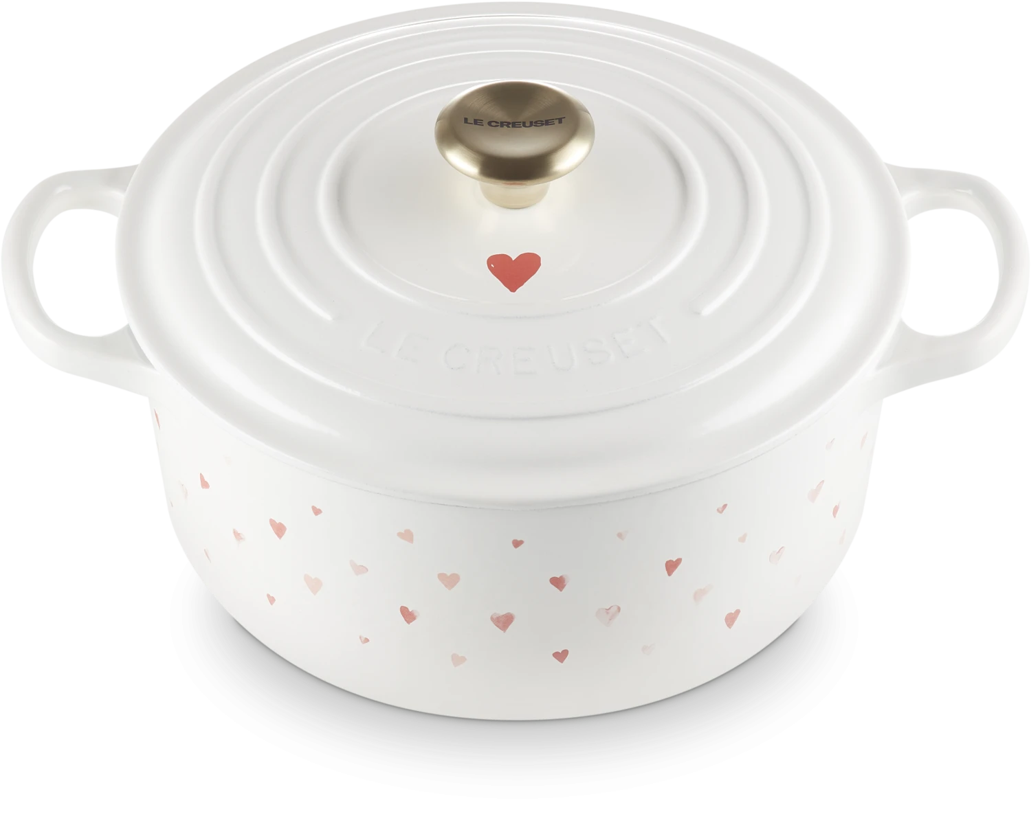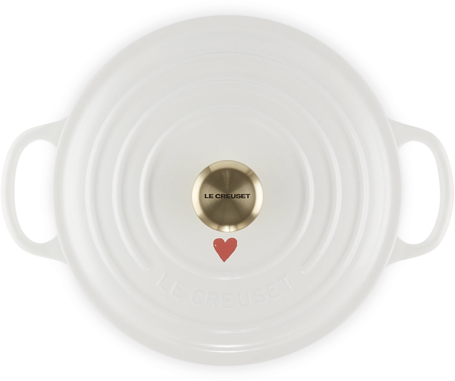 Le Creuset Bräter Signature rund Hearts, 22 cm. Wenn hier nicht mit Herz gekocht wird: Der liebevoll designte Kochtopf aus Gusseisen ist ideal für die Zubereitung von Eintöpfen und Schmorgerichten. Mit hellgoldenem Deckelknopf und 3,3 L Fassungsvermögen.