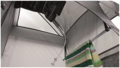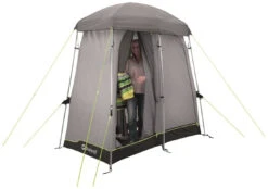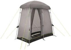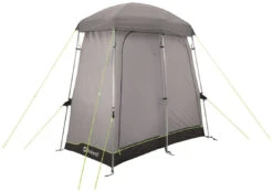 Bringing convenience to the pitch. This single toilet tent offers the facility to discretely house a chemical toilet, with room to shower using an optional Outwell shower bladder slung in the ceiling hammock a vinyl roof window catches the suns rays to heat up the water. Features include protected ventilation panels, towel rail, pockets and groundsheet with drain mesh..