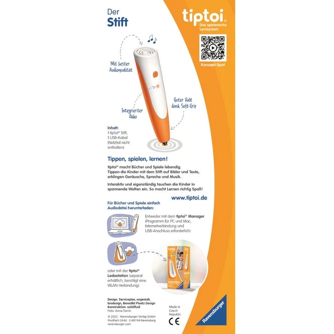 Der tiptoi-Stift macht Bücher und Spiele lebendig. Für noch mehr tiptoi-Spaß sorgt die überragende Audioqualität des Stiftes, mit dem die Kinder jetzt in ein noch intensiveres Hörerlebnis eintauchen – interaktiv und eigenständig. Dank der Stifthülle aus Soft-Grip-Material liegt der Stift gut in der Kinderhand. Der integrierte Akku bietet mehr Komfort. Der tiptoi-Stift der 4. Generation ist mit allen tiptoi-Produkten kompatibel (abgesehen von den CREATE Produkten).Tippen, spielen, lernen! tiptoi macht Bücher und Spiele lebendig. Tippen die Kinder mit dem Stift auf Bilder und Texte, erklingen Geräusche, Sprache und Musik. So macht Lernen richtig Spaß! Das tiptoi-Sortiment umfasst Bücher und Spiele mit den wichtigsten Lern- und Wissensthemen für Kinder ab 2 Jahren. Die zugehörigen Audiodateien lädt man einfach, sicher und schnell über den tiptoi Manager oder die optional erhältliche Ladestation auf den Stift.