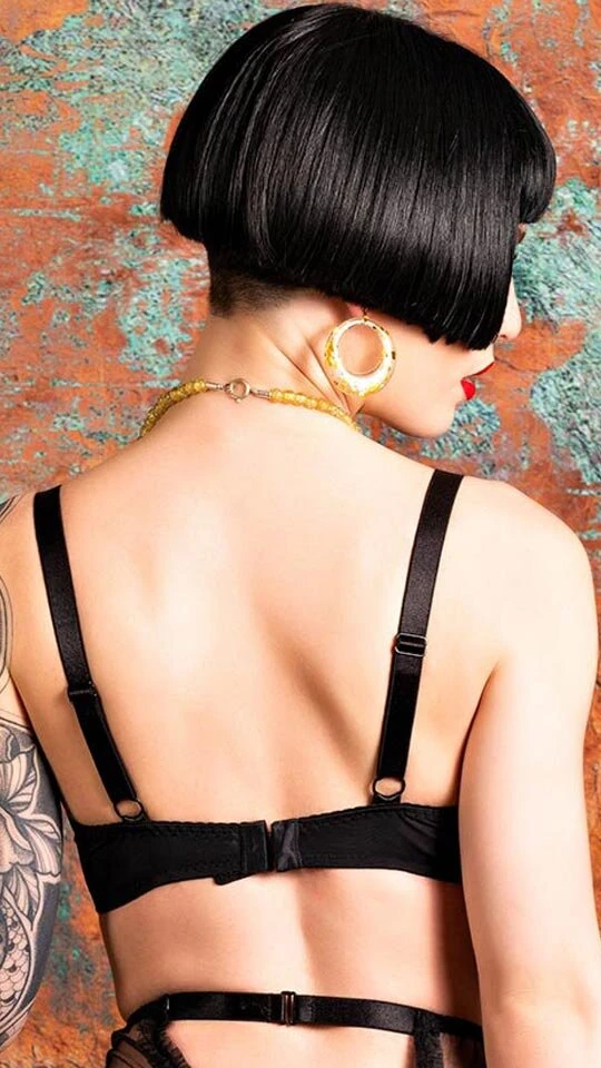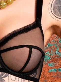 Super sexy und supertransparenter BH aus schwarzem Nylonnetz, welches  stark genug ist, um den nötigen Halt zu geben. Zarte, handgefaltete Rüschen zieren die Oberseite der Körbchen. Dieser Bügel-BH ist sehr durchsichtig, ist ungepolstert und hat seitliche Bügel.