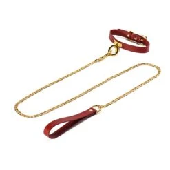 Mit dieser Führleine gibst Du stilvoll vor, wo es lang geht. Die lange, goldfarbene Metallkette lässt sich mit dem integrierten Karabinerhaken durch einen Klick am beiliegenden Halsband befestigen. Die Kette ist stabil genug, um auch mal etwas fester daran zu ziehen. Am andere Ende der Leine ist eine Handschlaufe aus italienischem Rindsleder, die gut und sicher in deiner Hand liegen wird.