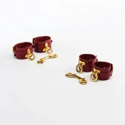Die Fußfesseln lassen sich dank der Schnalle aus nickelfreiem, goldfarbenem Metall individuell auf den benötigten Umfang zwischen ca. 18,5 – 22 cm einstellen. Dekorative Metallbeschläge halten den Lederriemen an seiner Position.