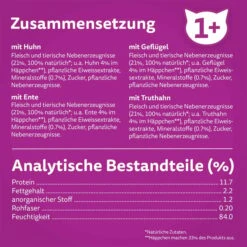 mit Ente: Fleisch und tierische Nebenerzeugnisse (21%, 100% natürlich*; u.a. Ente 4% im Häppchen**), pflanzliche Eiweissextrakte, Mineralstoffe (0.7%), Zucker, pflanzliche Nebenerzeugnisse. *Natürliche Zutaten. **Häppchen machen 33% des Produkts aus.