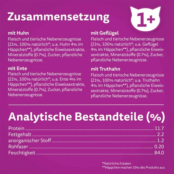 mit Geflügel: Fleisch und tierische Nebenerzeugnisse (21%, 100% natürlich*; u.a. Geflügel 4% im Häppchen**), pflanzliche Eiweissextrakte, Mineralstoffe (0.7%), Zucker, pflanzliche Nebenerzeugnisse. *Natürliche Zutaten. **Häppchen machen 33% des Produkts aus.