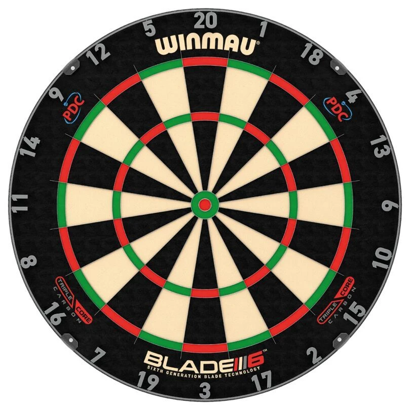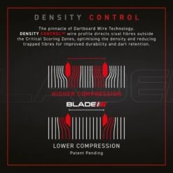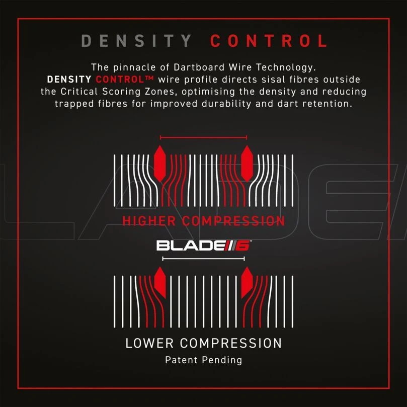 Das atemberaubend neue Design wird gekrönt durch den weltweit ersten lasergeschnittenen, blendfreien Zahlenring und sorgt für ein ultimatives Spielerlebnis. Die wegweisende Verdrahtung des Blade 6 besteht aus dem neuesten Density Control-Draht, der für eine optimale Faserdichte und einen verbesserten Halt der Darts in den Double-, Triple- und Bullseye-Zonen sorgt. Der ultradünne Draht im 60°-Winkel lenkt die Darts in den Trefferbereich und verringert deutlich die Zahl der Bouncer (Abpraller). Das Bullseye und das Outerbull haben gegenüber dem Blade 5 einen 25% dünneren Draht. Dadurch ergeben sich noch größere Score-Fläche im Bulls und es können leichter höhere Punktzahlen erzielt werden.